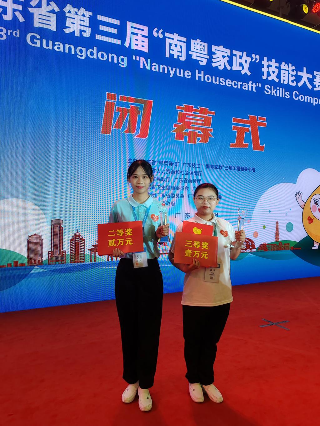 9月25日至27日,广东省第三届“南粤家政”技能大赛决赛在梅州举行,240多名选手同台竞技。玩滚官网医药卫生学院护理专业学生伍泳获得医疗护理员项目二等奖(第3名),智慧健康养老服务与管理专业学生梁文程获得养老护理员项目三等奖(第4名),指导教师柯盈盈、吴小芳分别获得“银牌教练”和“铜牌教练”称号。