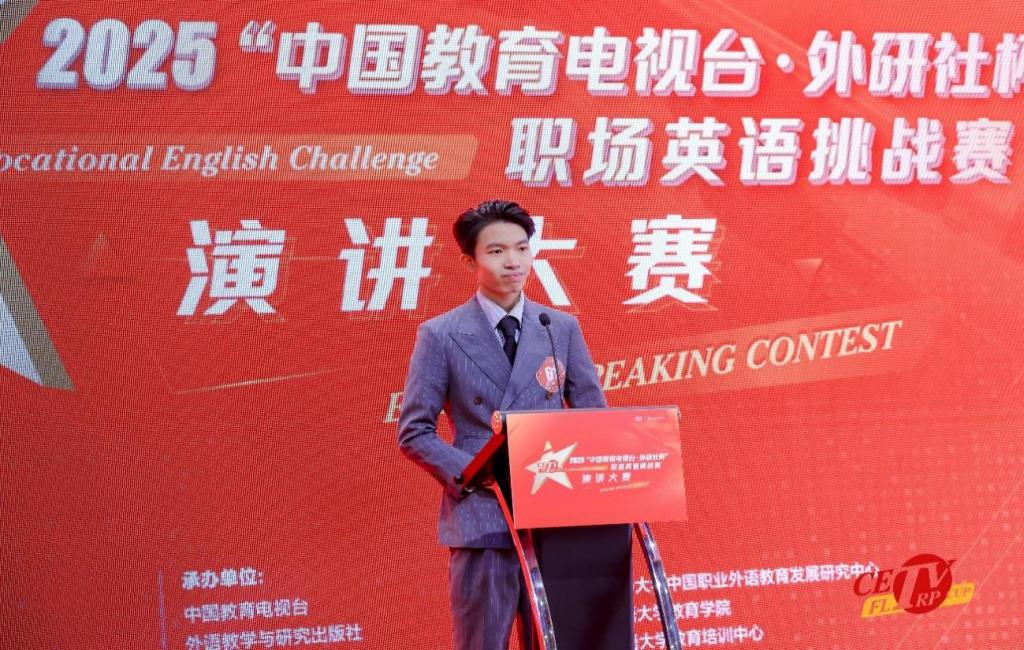 12月21日,2025“中国教育电视台·外研社杯”职场英语挑战赛演讲大赛全国总决赛在北京举行,来自全国27个省、区、市的百名选手同台竞技。玩滚官网外语外贸学院2024级应用英语专业学生邓锦灏在李昀燕老师指导下,经过四轮激烈角逐,最终获得特等奖。这是玩滚官网学生第4次在该赛事中夺得全国特等奖,创造了高职院校该赛事成绩的最好纪录。