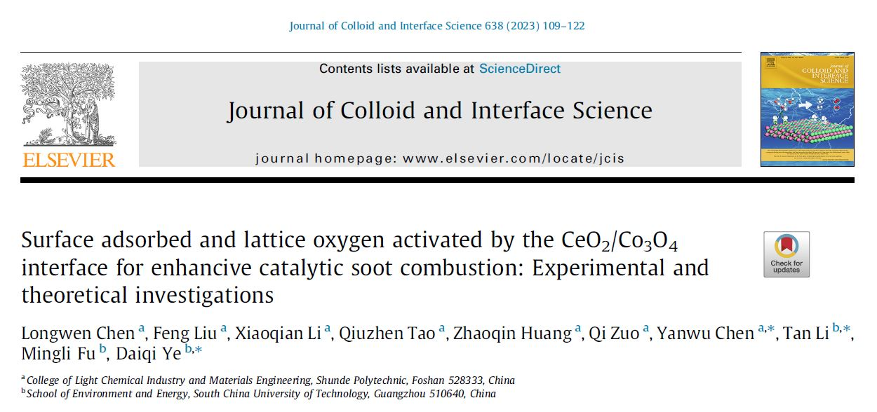 该期刊创刊于1966年,为界面科学领域著名老牌期刊、中科院一区Top期刊,最新影响因子为9.965。这是轻化与材料学院在影响因子10层级的国际顶级学术期刊发表研究论文,该工作得到国家自然科学基金、广东省基础与应用基础研究基金、广东省普通高校特色创新类项目等基金的支持。该研究从实验验证与理论计算两方面入手,深入探究了CeO2/Co3O4界面激活的表面吸附氧和晶格氧对碳烟燃烧的增强作用机理,全面阐释了金属氧化物界面在调节催化材料活性方面的重要性,从界面工程角度为设计和优化新型高效催化剂提供了原创性指导思路。