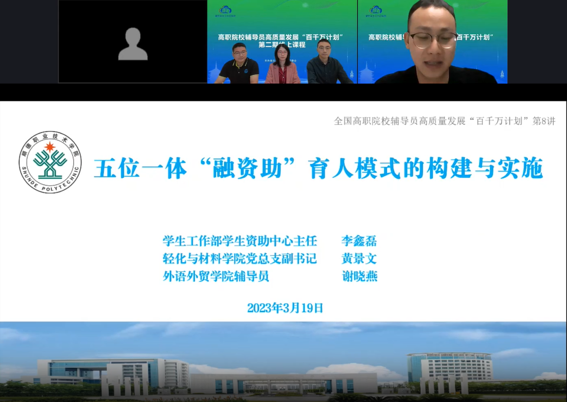今年以来,高职院校辅导员高质量发展“百千万计划”通过线上方式开讲。3月19日,玩滚官网学生工作部、轻化与材料学院、外语外贸学院教师作为第二期线上课程主讲团队之一,以《五位一体“融资助”育人模式的构建与实施》为题,首次向全国学生工作团队分享资助育人工作经验,展示玩滚官网学工风采。