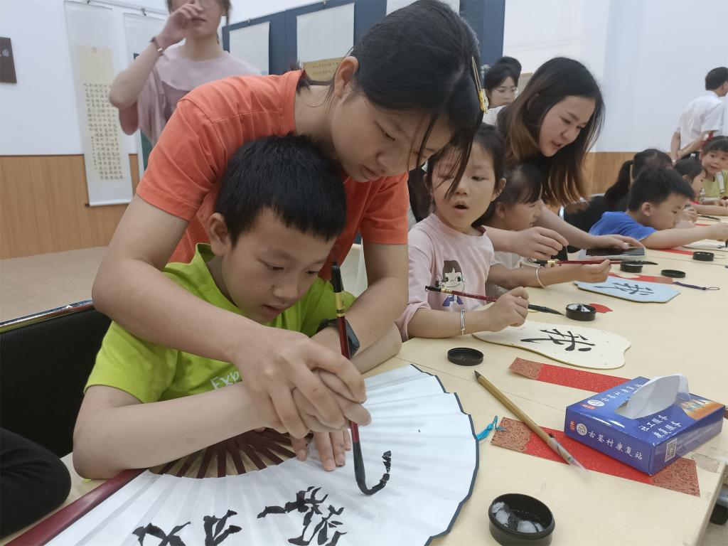 为让辖区青少年在翰墨书香中感受书法的魅力,增进对书法的了解,现场设置了教学指导环节,玩滚官网师生指导当地少年儿童练习书法。孩子们认真听讲,一笔一划地在纸上临摹练习,在老师手把手指导下,在折扇、团扇、书签上题字。孩子们捧着自己的书法纪念品笑开了花,纷纷表示书法很有趣,希望能继续深入学习。