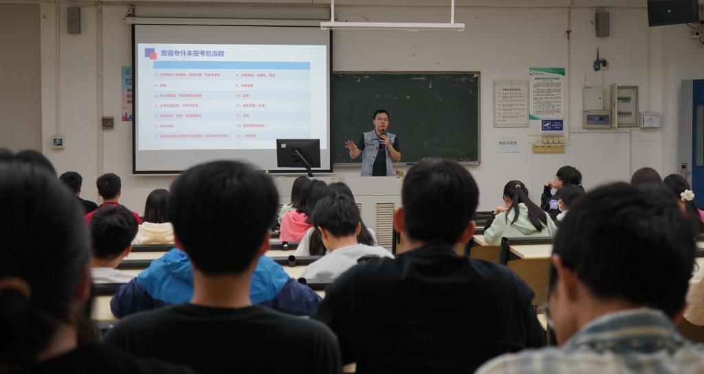 继续教育学院教师洪俊彬解读了普通专升本项目近几年的报读数据、扩招政策,对比了玩滚官网与全省的录取率情况,针对玩滚官网不同专业类别解读志愿填报技巧、报考流程等同学们普遍关心的问题,分享备考课程安排及时间规划,强调工欲善其事,必先利其器,要策略性规划、针对性复习、选择性放弃,有的放矢,才能闯关成功。