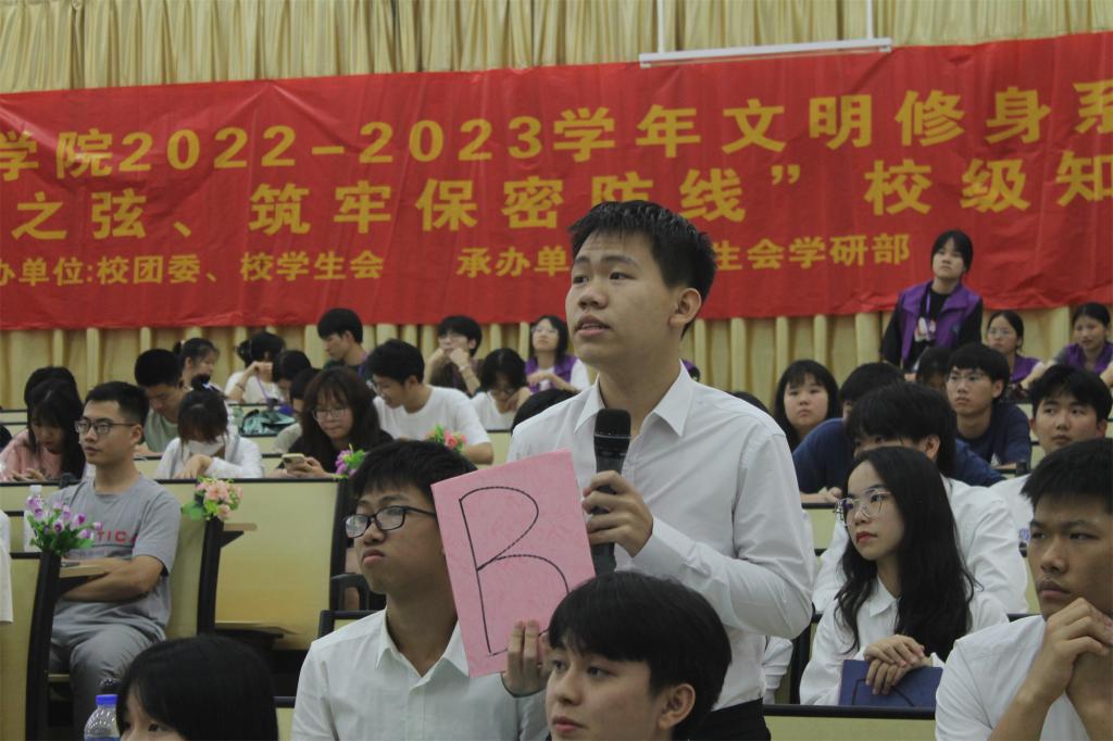 为深入贯彻落实总体国家安全观和保密工作要求,进一步加强保密法律法规宣传教育,增强师生保密意识,6月7日晚,由校团委、校学生会主办的玩滚官网2022-2023学年第二学期“文明修身”系列活动之“紧绷保密之弦,筑牢保密防线”校级知识竞赛在教学楼8-200举行。