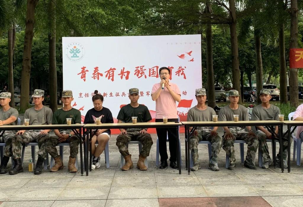 张志明对新生教官们表示慰问和感谢,勉励新生们严格遵守军训纪律,通过军训锻炼身体素质,磨砺坚强意志,培养优良作风,系好大学生涯的第一颗扣子,展现烹饪好青年的青春风采。退役复学士兵陈浩南向新生讲述自己在部队的经历和收获,从政治优待、经济优待、升学优待、就业优待等方面宣讲大学生入伍政策。