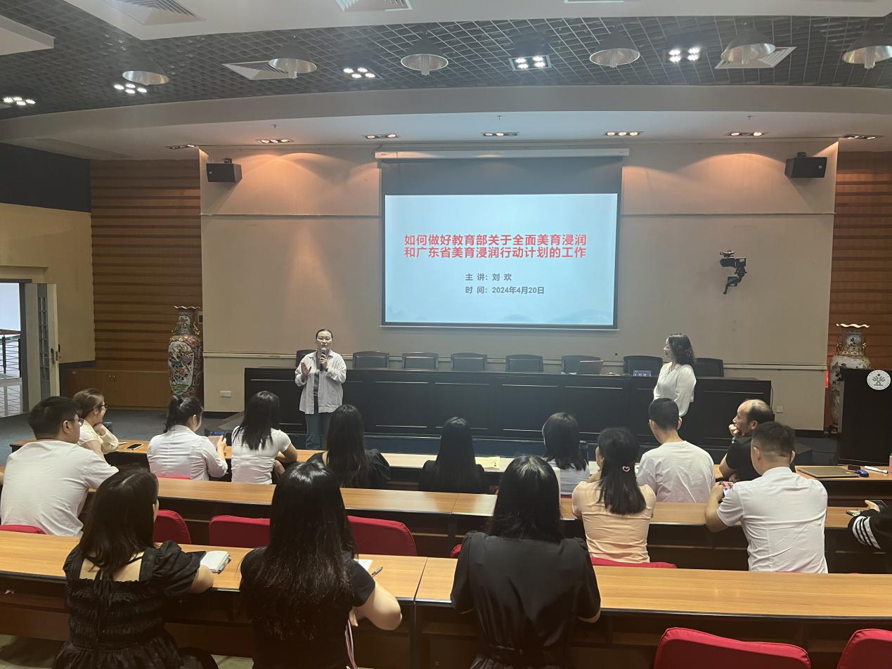 4月20日上午,校团委组织阳江市教育局一行16位老师,联合韶关市地区有关美育老师开展美育浸润行动计划之师资培训。本次培训特邀请广东省中小学美育名教师、韶关市曲江初级中学教师刘欢,以《如何做好教育部关于全面美育浸润和广东省美育浸润行动计划的工作》为题,开展一场全面美育浸润讲座及研讨形式的师资培训。随后,老师们一行还参加了广东省教育厅组织的第二届中小学粤东粤西粤北地区中小学优秀团队合唱展演讲座及研讨,并进行整个过程的合唱观摩学习。