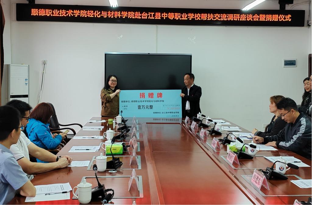 会上,黄健光介绍了台江职校在组团式教育帮扶上取得的成果和经验;陈燕舞与刘红对近些年赴台江职校帮扶的老师所展现出的帮扶精神表达敬意。双方围绕在“三教”改革、教学能力比赛、专业建设、技术服务以及党建等方面进行了交流。陈燕舞代表学院向台江职校捐赠壹万元。