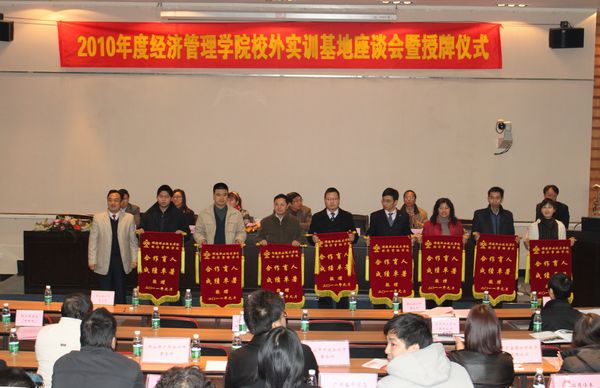 1月8日上午,玩滚官网经济管理学院在学术报告厅举行2010年度校外实训基地座谈会暨授牌仪式。顺德圣托电器有限公司等23家授牌匾企业代表,金鼎财会咨询有限公司等10家授锦旗企业代表,玩滚官网陈粟宋副院长,教务处、经济管理学院相关负责人,教师代表共80人参加了会议。