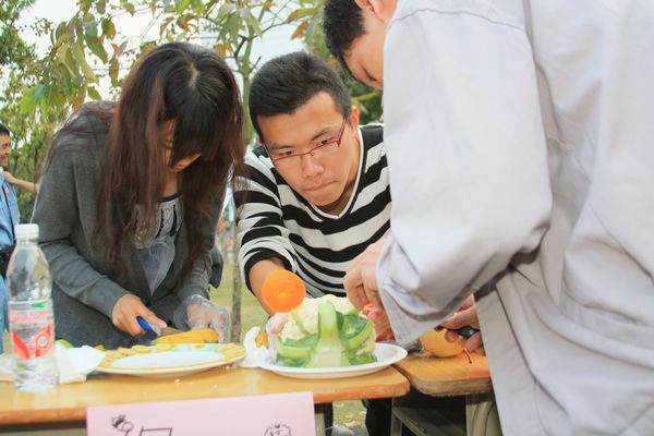 伴随着现场动感的音乐,到场嘉宾为本次活动作了剪彩。本次活动共有15支参赛队伍参与角逐,他们分别来自酒店及旅游管理系、经济管理学院、机电工程系、医学系、外语系以及艺术设计学院,各参赛队伍按照比赛要求制作一道水果拼盘,并为其命名。比赛中,选手们团结协作、配合默契,充分体现了他们的团队精神,做出来的每个拼盘各具特色,别出心裁,取名更是匠心别具,如:含苞欲放、绿色营养、雪冰纷、花儿朵朵等,不仅使观众朋友们耳目一新,而且表达了他们对女生节的美好祝福。
