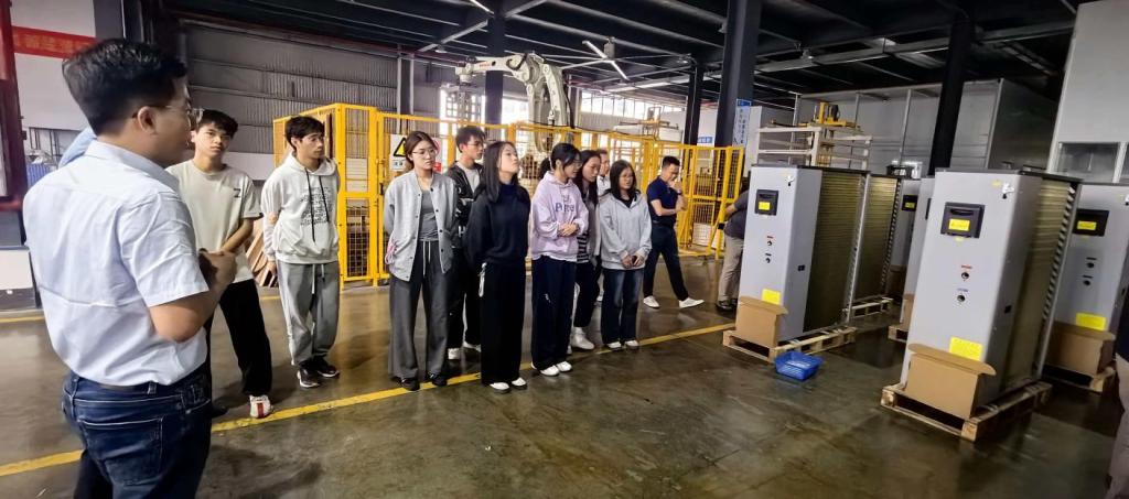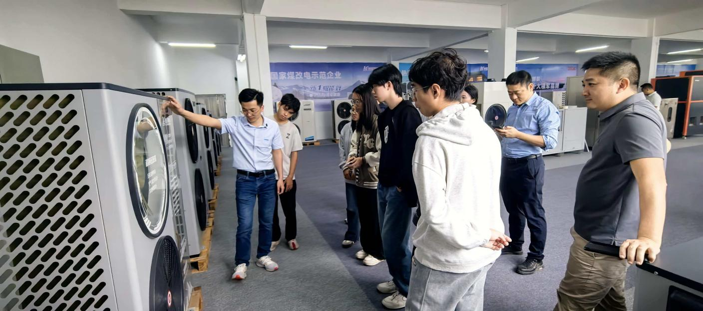 在唐汝充的细致解说下,同学们近距离观摩了热泵与超低温变频采暖热泵(冷水)机组的智能化生产组装流程,重点了解了企业在节能技术研发、产品质量管控上的核心标准与创新举措——包括参与起草13项国家及行业标准的技术积淀、70余项国家专利的成果转化,以及世界领先的承压水箱保护器研发应用等核心技术优势。参访过程中,同学们还实地参观了国家认证的-41.5℃空气源热泵性能测试实验室,直观感受了企业在超低温热泵技术领域的硬实力,对热泵产业的技术迭代节奏与现代化企业运营研发体系建立了清晰且深刻的认知。