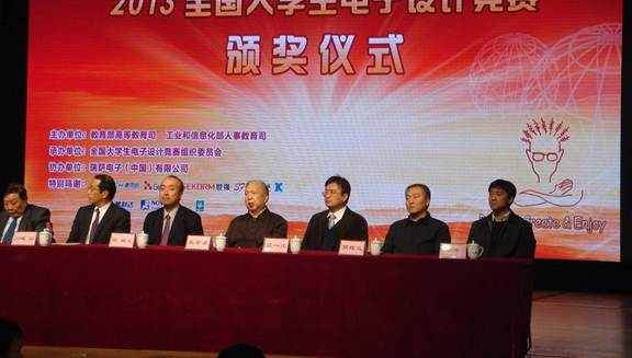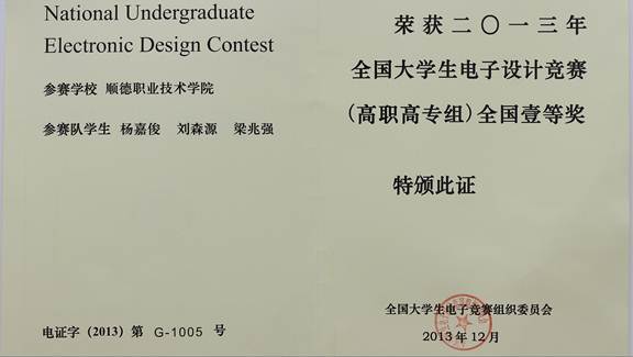 2013年12月7日,由教育部和工信部主办的“瑞萨杯2013全国大学生电子设计竞赛”颁奖典礼在北京航空航天大学隆重举行。玩滚官网电子与信息工程学院在本届大赛中取得了历史性突破,由昂勤树、谢飞老师指导的参赛作品“L题:直流稳压电源及漏电保护装置”以广东赛区高职高专组该题测评成绩第一的出线,并获得国赛一等奖;由蔡永昶、吴锦麟老师指导的J题获国赛二等奖。广东省共有来自玩滚球的十大正规平台、深圳职业技术学院和中山火炬职业技术学院三支队伍获高职高专组国赛一等奖,并赴京参加颁奖大会。