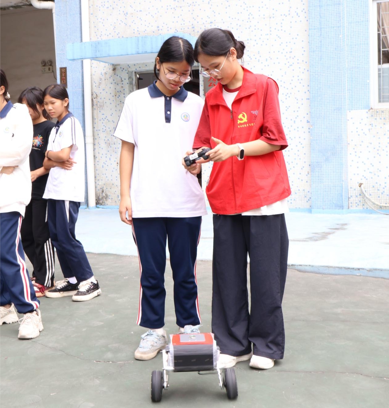 在六都镇南乡中学的科技课堂上,突击队队员们向孩子们展示了“智醒狮”四足机器人、轮足机器人和机甲战车等,并用通俗易懂的语言讲解机器人的平衡控制和步态算法;在实践环节,孩子们在大学生指导下亲手操作“智醒狮”机器人、轮足机器人、机甲战车和智能小狗等设备。这些互动体验不仅让孩子们感受到科技的魅力,更重要的是激发了他们对机器人技术的兴趣。